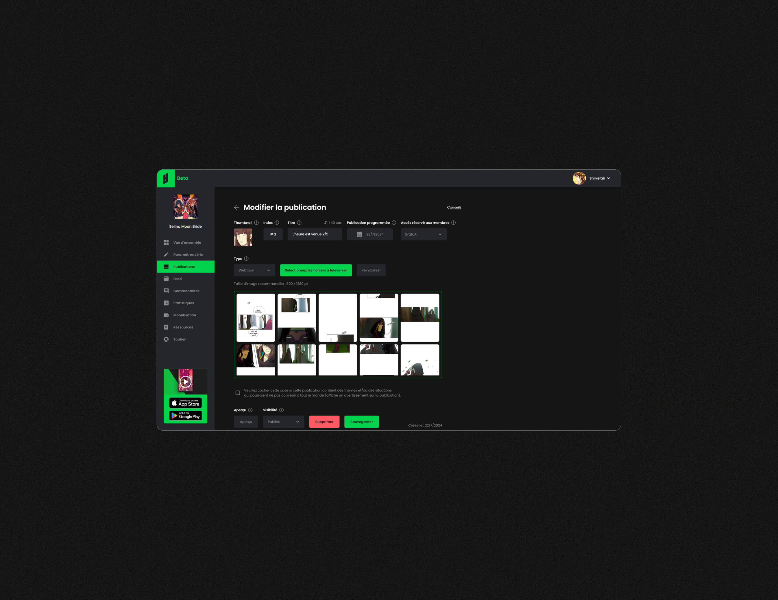 Après une vérification manuelle de votre série, vous aurez immédiatement accès à nos fonctionnalités de monétisation, notamment les memberships (abonnement mensuel) et votre propre boutique (à venir). Nous avons simplifié la publication et la monétisation afin que vous puissiez vous concentrer sur ce que vous aimez le plus : Créer ! 🎨